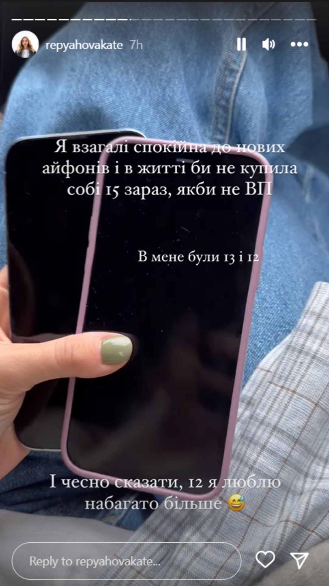 Я взагалі спокійна до нових айфонів і в житті б не купила собі 15 зараз, якби не Віктор Павлік. В мене були 13 і 12. І чесно сказати, 12 люблю набагато більше,