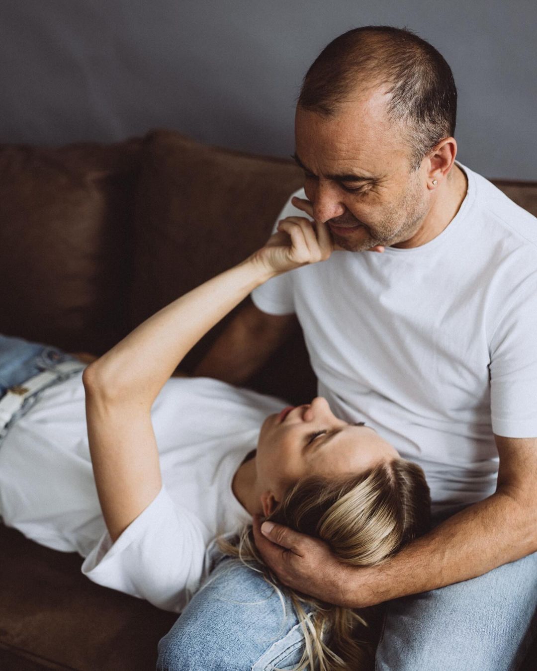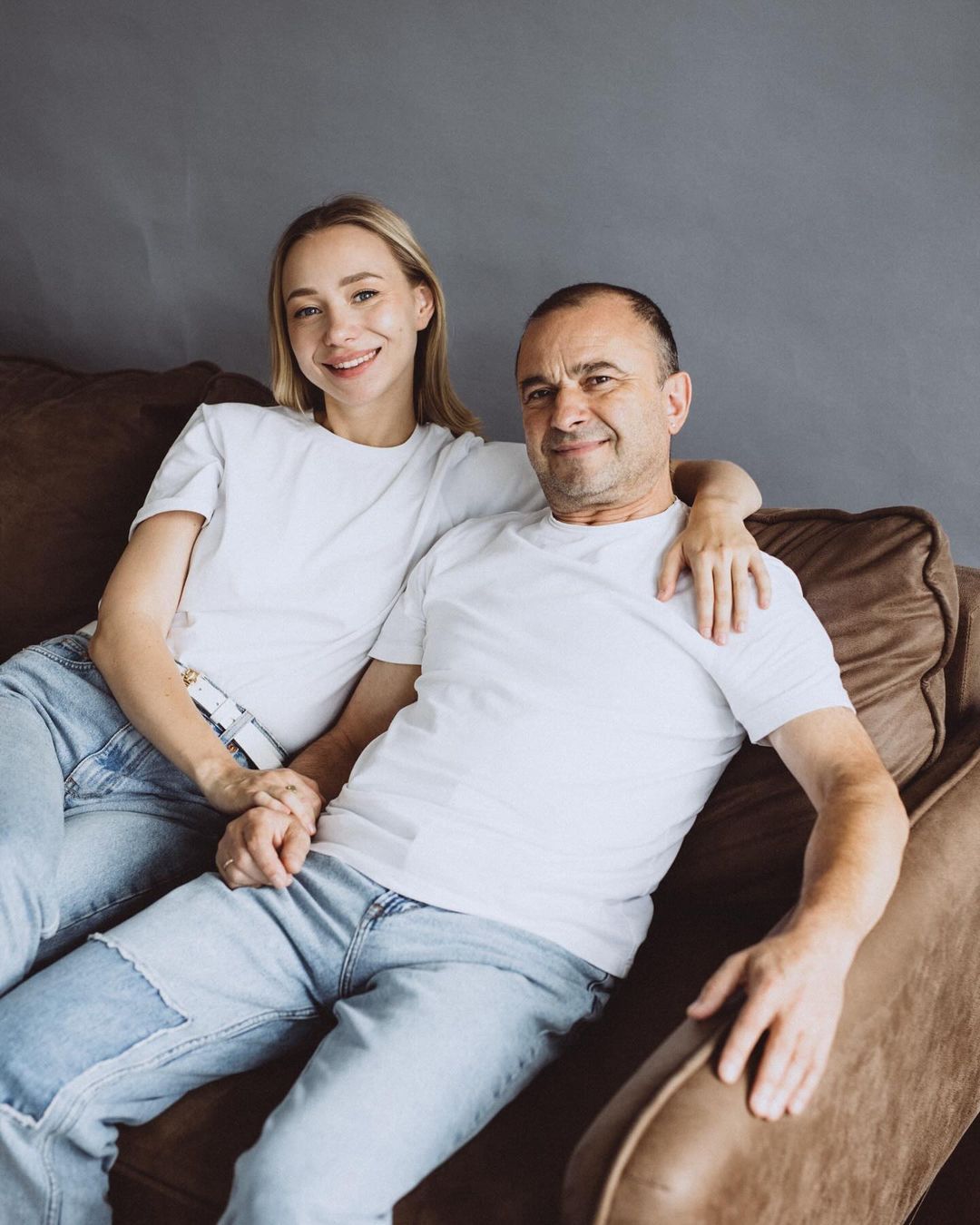 Подружжя знялось у романтичній фотосесії. Вони постали у парних образах – блакитних джинсах та білих футболках. Катерина та Віктор позували в обіймах і тримаючись за руки.
