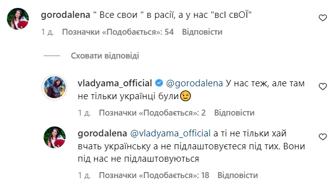 "Все свои" в Росії, а у нас "всі свої", – дорікнули Владу Ямі в коментарях. Він, на диво, відповів: "У нас теж, але там не тільки українці були". Однак перепалка з підписницею продовжилася, бо, на її думку, всі, хто нас підтримує, повинні вчити українську мову: "А ті "не тільки" хай вчать українську, а не підлаштовуєтеся під тих. Вони під нас не підлаштовуються", – написала дівчина, тоді танцівник з іронією запитав: "Казахам теж українську вчити?"
