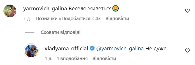 Також одна з користувачок інстаграму написала, що Владу Ямі "весело живеться", а той відповів: "Не дуже".