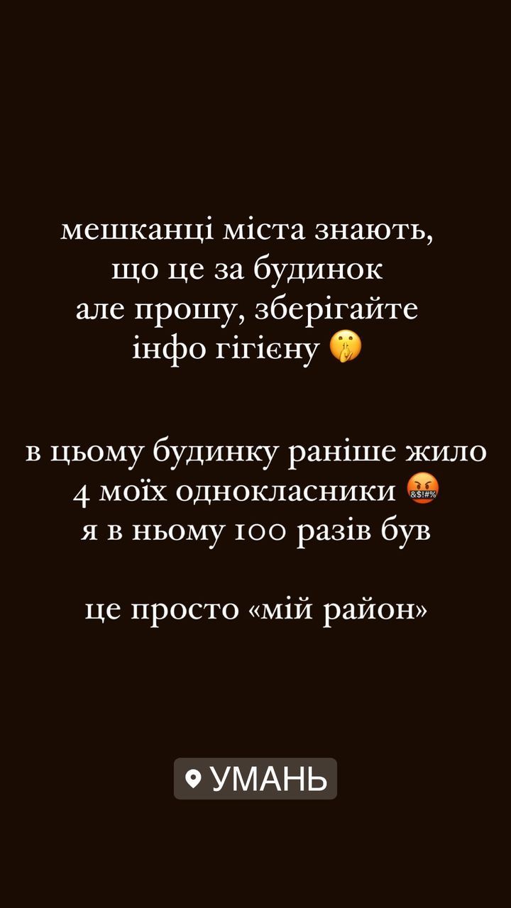 Я повз цей будинок у школу ходив. Дякую за підтримку, з батьками все добре. Мешканці міста знають, що це за будинок, але прошу, зберігайте інформаційну гігієну. У цьому будинку раніше жило 4 моїх однокласники. Я в ньому сто разів був. Це просто "мій район".