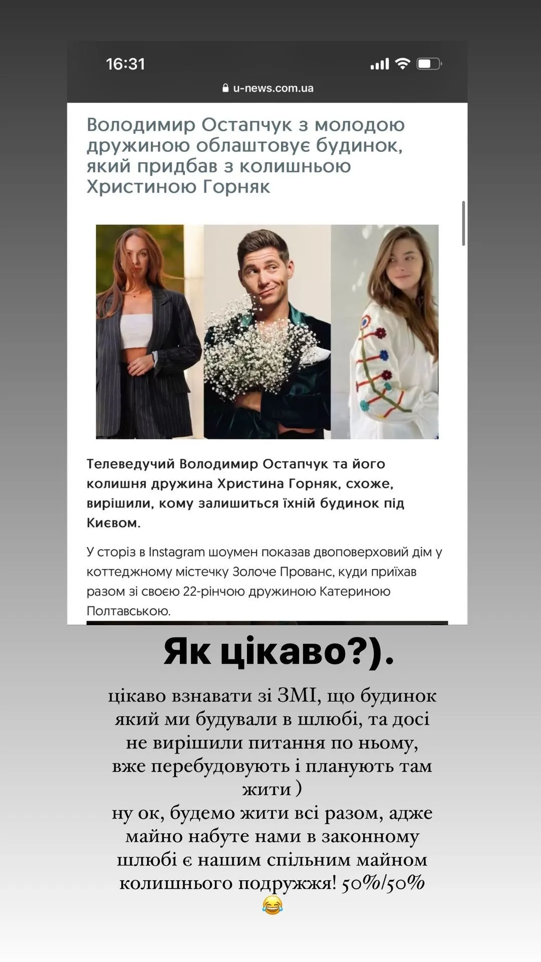 Як виявилося, нотаріусиня не знала про візит ексчоловіка до їхнього спільного дому. Вона пожартувала, що коли Остапчук хоче жити у будинку з дівчиною, то помешкання буде для них всіх спільним.