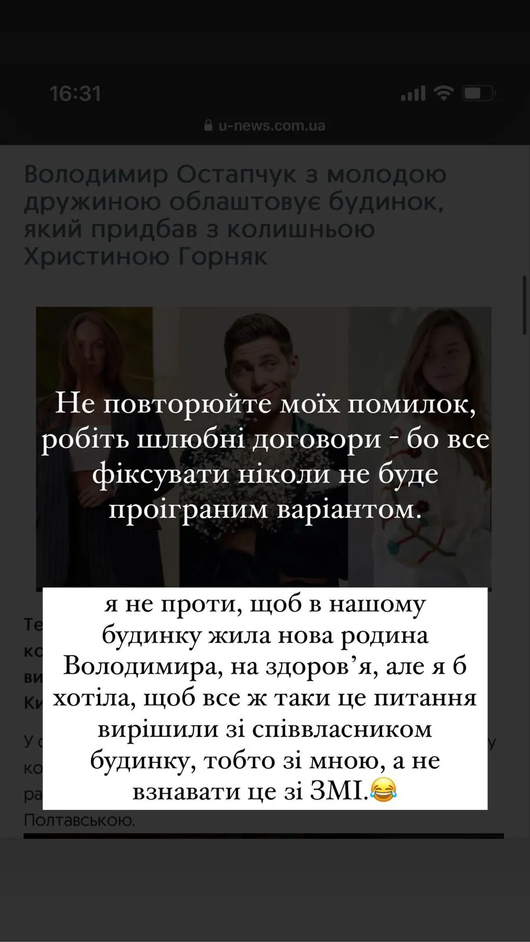 "Не повторюйте моїх помилок, укладайте шлюбні договори. Тому що все фіксувати, ніколи не буде програшним варіантом. Я не проти, щоб у нашому будинку жила нова родина Володимира, на здоров'я, але я хотіла б, щоб це питання вирішували зі співвласником будинку, тобто зі мною, а не дізнаватися це зі ЗМІ".