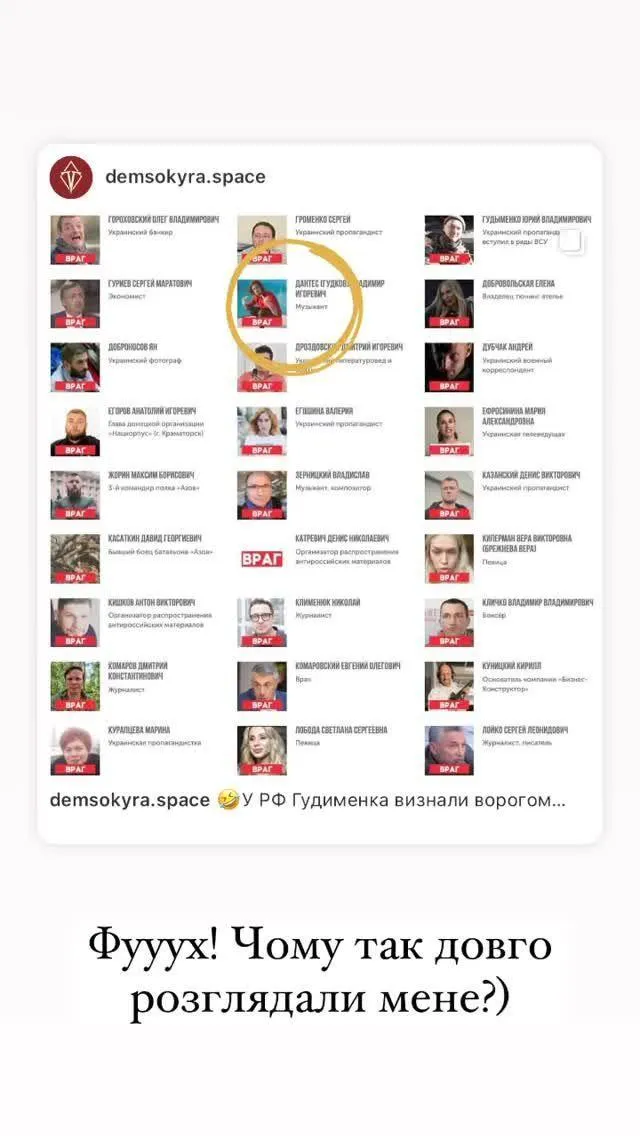 Співак поділився новиною в інстаграм-сторіз. Він з гумором відреагував на внесення до списку ворогів, пожартувавши про те, чому його кандидатуру розглядали так довго.