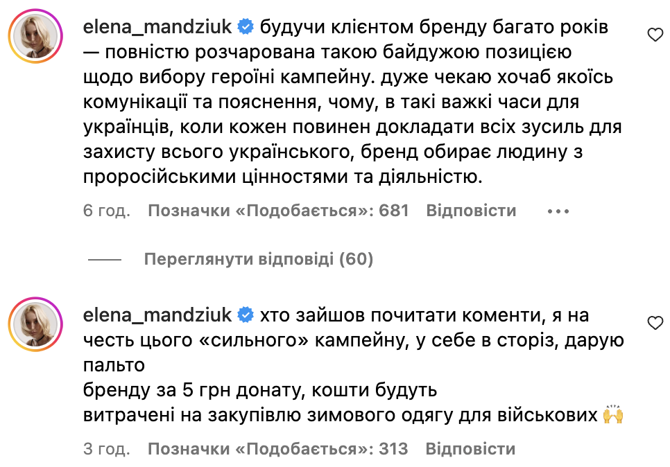 Дуже чекаю хоча б якоїсь комунікації та пояснення, чому в такі важкі часи для українців, коли кожен повинен докладати всіх зусиль для захисту всього українського, бренд обирає людину з проросійськими цінностями та діяльністю,