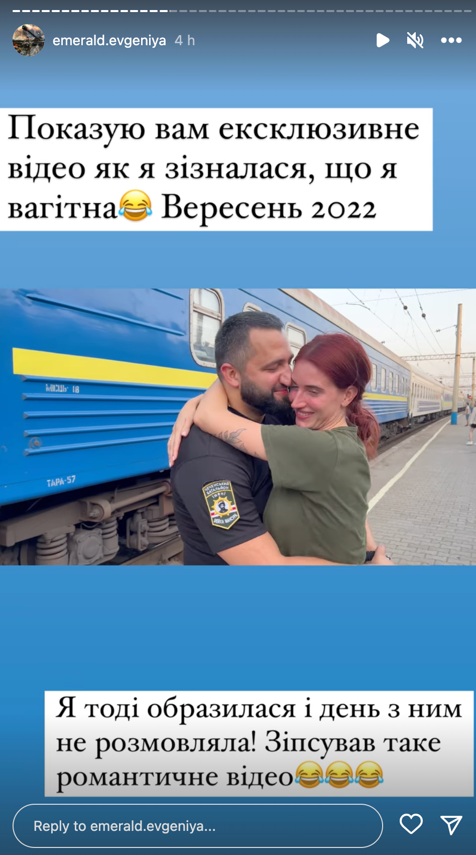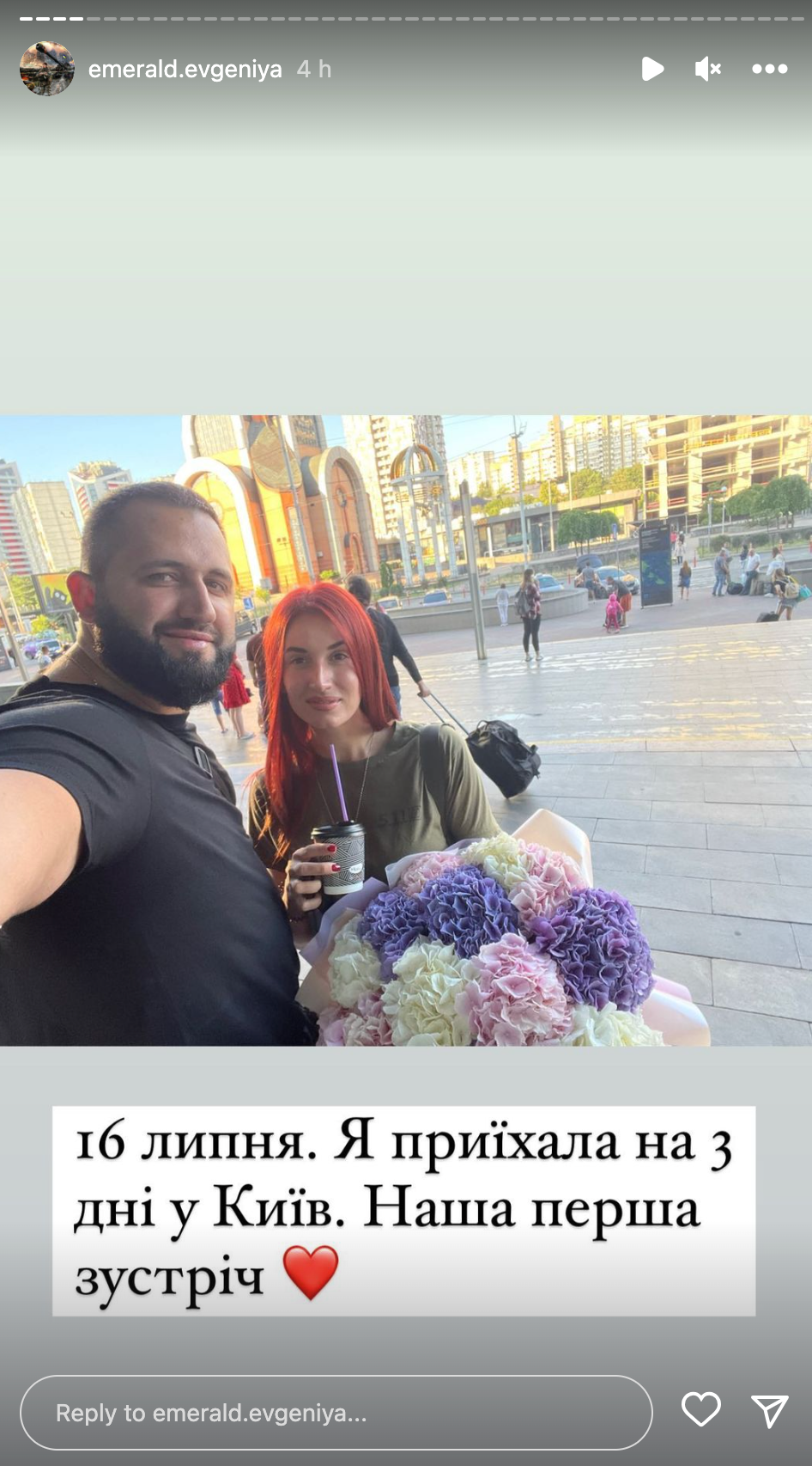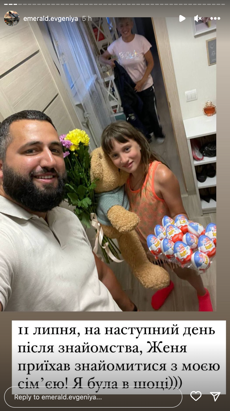 В інстаграм-сторіс Емеральд показала важливі та зворушливі моменти їхніх стосунків. Наприклад, як чоловік знайомився з донькою Євгенії, а також їхнє перше побачення, пологи та рідкісні зустрічі.