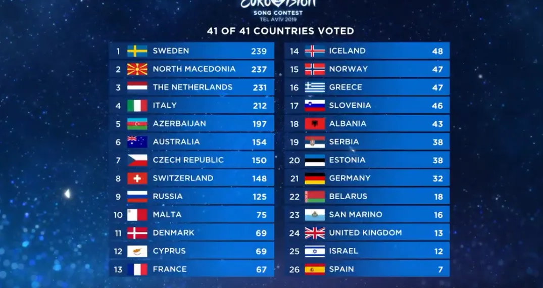 18 травня відбувся фінал Євробачення-2019, де свої номери показали 26 учасників. Представники країн виступили у першому і другому півфіналах, відтак 20 з них отримали путівку до завершального етапу шоу. Водночас 6 країн-учасників потрапили до фіналу автоматично: країна-господар Ізраїль, Італія, Великобританія, Іспанія, Німеччина та Франція.