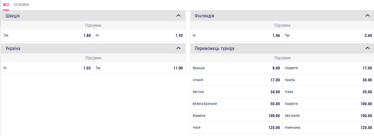- Швеція – коефіцієнт 1,80 (чим нижчий коефіцієнт, тим більші шанси на перемогу).