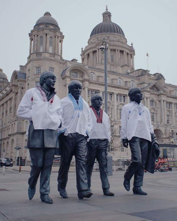 Скульптура легендарної "ліверпульської четвірки" розташована на набережній Pier Head. Зараз BBC знімає там фільм, який покажуть під час Євробачення-2023. Тож The Beatles одягли у вишиванки, їх привезли спеціально з України.
