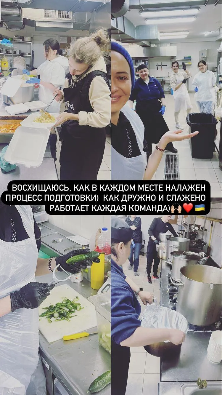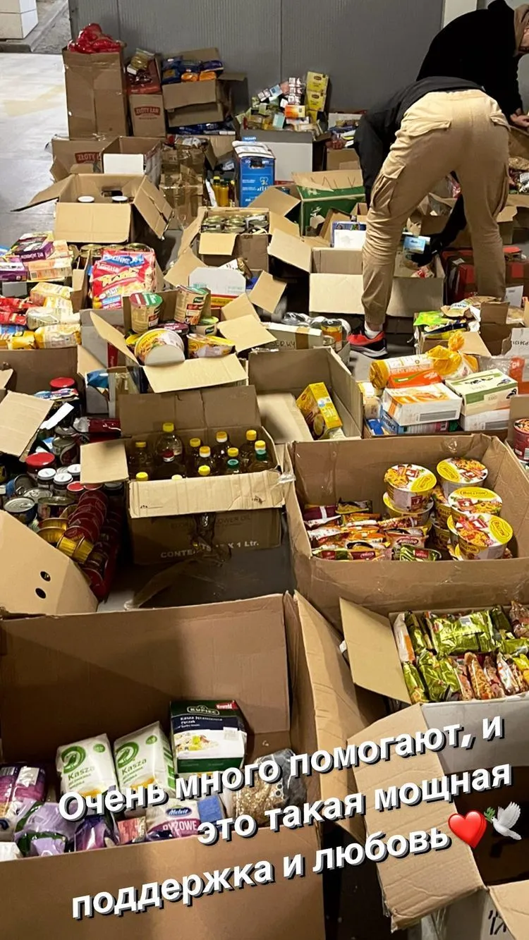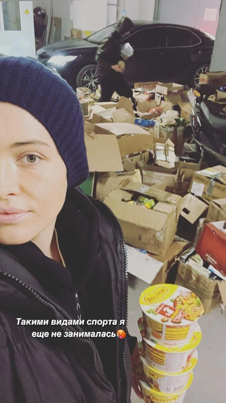 У понеділок, 7 березня, українська модель встигла допомогти не тільки на кухні, а й волонтерам, які розвантажували гуманітарну допомогу з Польщі, Литви та інших країн-сусідок. У величезних коробках були імпортні солодощі, олія, консерви, чай, крупи, які роз'їхалися по всій Україні.